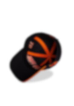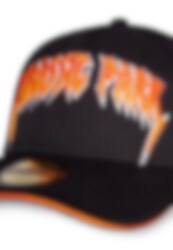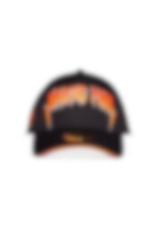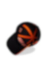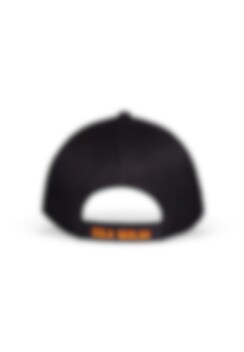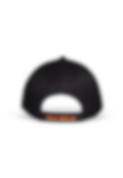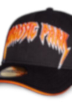 Coole Baseball-Kappe in Schwarz mit Orangetönen und mit dem ikonischen Jurassic Park-Logo auf der Vorderseite der Kappe und Dinosaurier-Logomotiv auf einer Seite.