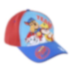 Hübsche Kinderkappe in blauen und roten Farben mit einem Design der beliebten Rettungshunde Marshall, Chase und Rubble aus Paw Patrol. Die Kappe besteht aus 65% Baumwolle und 35% Polyester.