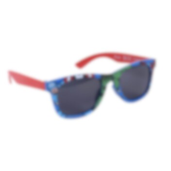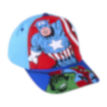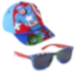 Ein komplettes Set mit einer coolen blauen und roten Kappe mit den Avengers-Superhelden darauf und einer hochwertigen Sonnenbrille, beide in Kindergröße. Auf der Brille sind der Hulk, Captain America und Spiderman abgebildet.