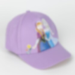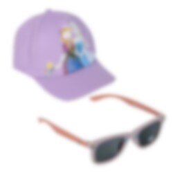 Ein komplettes Set mit einer schönen lavendelfarbenen Kappe und einem Paar Premium-Sonnenbrillen, beide in Kindergröße. Auf den Brillen sind Motive aus Disney Frozen.
