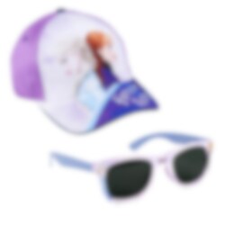 Ein komplettes Set mit einer schönen Anna- und Elsa-Kappe und einer Premium-Sonnenbrille, beide in Kindergröße. Die rosafarbene und blaue Brille zeigt Bilder der beiden Schwestern aus Disneys Blockbuster Frozen und den Text "Forever sisters".