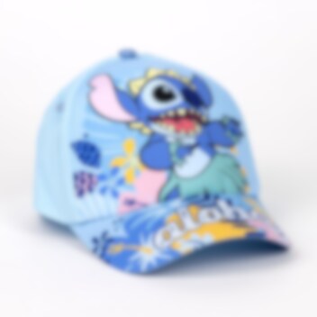 Ein komplettes Set mit einer schönen hellblauen Kappe und einem Paar Premium-Sonnenbrillen, beide in Kindergröße. Auf den Brillen sind Motive von Stitch aus der Serie Lilo & Stitch.
