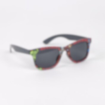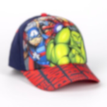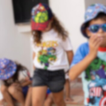 Ein komplettes Set mit einer coolen mehrfarbigen Kappe und einem Paar Premium-Sonnenbrillen, beide in Kindergröße. Auf den Brillen sind Motive von der Avengers-Crew.