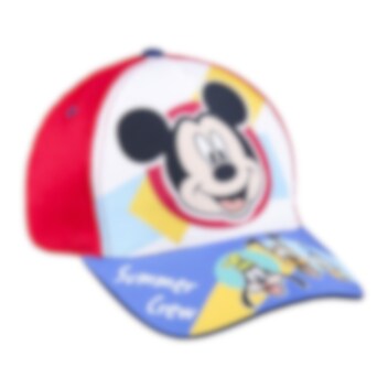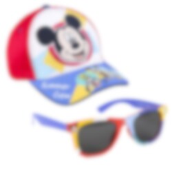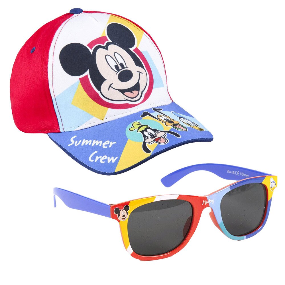 Ein komplettes Set mit einer coolen blauen und roten Kappe und einer hochwertigen Sonnenbrille, beide in Kindergröße. Die Brillen sind mit den beliebten Disney-Figuren Mickey Maus und Donald Duck gestaltet.