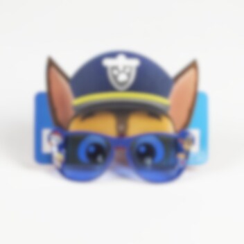 Premium-Sonnenbrille für Kinder in den Farben Rot und Blau mit coolen Paw Patrol-Motiven und -Text. Auf den Rahmen um die blau getönten Brillengläser sind Marshall und Rubble auf der einen Seite und Chase auf der anderen Seite zu sehen.
