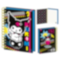 Das Notizbuch im A5-Format hat ein schwarzes Cover mit auffälligen Akzenten in Pink, Blau und Gelb sowie Kuromi in ihrem typischen Stil. Mit Spiralbindung und liniertem Papier, ideal für Schule, Beruf oder kreative Notizen.
