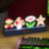Diese dekorative Lampe ist 30 cm breit und zeigt drei klassische Power-Ups aus Super Mario™ – Super Mushroom, Super Star und Fire Flower – auf einer stabilen Basis. Schalte die Lampe ein und sieh, wie diese legendären Symbole leuchten! Die Lampe verfügt außerdem über einen Phasenmodus, bei dem die Motive nacheinander aufleuchten, sowie über einen musikreaktiven Modus, der das Licht mit der Umgebung synchronisiert.
