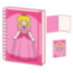 Das Notizbuch im A5-Format hat ein rosafarbenes Cover mit Princess Peach in ihrem klassischen Kleid, Spiralbindung und linierte Seiten. Perfekt für Schule, Notizen oder kleine Geheimnisse aus dem Pilzkönigreich.