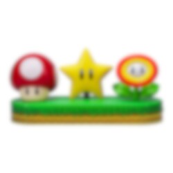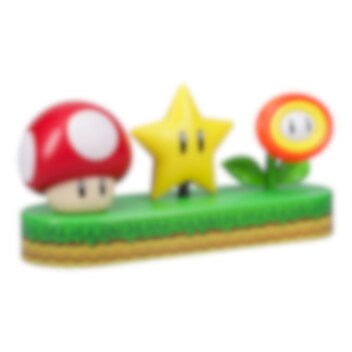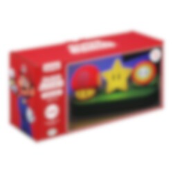 Diese dekorative Lampe ist 30 cm breit und zeigt drei klassische Power-Ups aus Super Mario™ – Super Mushroom, Super Star und Fire Flower – auf einer stabilen Basis. Schalte die Lampe ein und sieh, wie diese legendären Symbole leuchten! Die Lampe verfügt außerdem über einen Phasenmodus, bei dem die Motive nacheinander aufleuchten, sowie über einen musikreaktiven Modus, der das Licht mit der Umgebung synchronisiert.