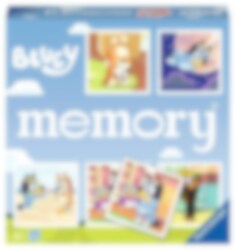 Memory-Spiel mit 64 Karten im Bluey-Thema. Wer kann sich die verschiedenen Bilder am besten merken und dann zuordnen?