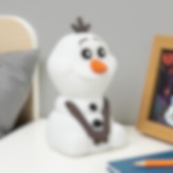 Lassen Sie den charmanten Schneemann Olaf den Raum erhellen. Diese 15 cm hohe Nachtlampe aus Silikon zeigt Olaf aus Die Eiskönigin und strahlt ein angenehmes weißes Licht aus. Die Lampe verfügt über eine automatische Abschaltfunktion, die sich nach 1-3 Stunden aktiviert, und die Helligkeit lässt sich einfach durch Drücken des Kopfes einstellen.