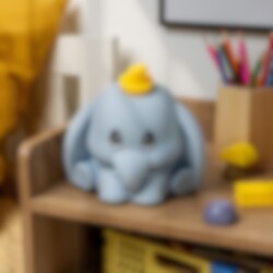 Lassen Sie den süßen Elefanten Dumbo ein sanftes Licht im Raum verbreiten. Diese 15 cm hohe Lampe aus Silikon zeigt Dumbo in einer niedlichen sitzenden Pose mit seinem klassischen gelben Hut. Sie strahlt ein angenehmes weißes Licht aus und verfügt über eine automatische Abschaltfunktion, die die Lampe nach 1-3 Stunden ausschaltet. Die Helligkeit lässt sich ganz einfach durch Drücken des Kopfes einstellen.