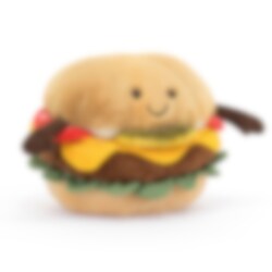 Ein leckerer, kleiner Burger mit sonnigem Lächeln und ordentlich gefüllt mit leckerem Inhalt. Das zweifarbige, goldbraune Hamburgerbrötchen mit den lustigen Armen aus dunkelbraunem Kord ist mit einer fluffigen Gurke, ein paar Tomatenscheiben, sonnengelbem Käse und einer Rüsche aus grünem Salat in Wildlederimitat gefüllt. Und der Star ist natürlich ein dicker, fluffiger Hamburger. Ein unterstützender und ermutigender Kumpel oder ein Trostpflaster, das Jung und Alt gleichermaßen zum Lächeln bringt. Bei Bedarf von Hand waschen.