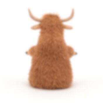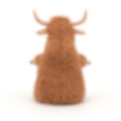 Eine ziemlich pummelige und wunderbar flauschige schottische Hochlandkuh, die sich nach dem Herumtollen auf den grünen Wiesen ausruht. Mit ihrem dichten rotbraunen Fell, dem fröhlichen Lächeln auf der zweifarbigen Schnauze, den schokoladenbraunen Hufen und den leicht gebogenen Hörnern aus Wildlederimitat ist dieser Liebling ein knuddeliger Freund zum Liebhaben. Bei Bedarf von Hand waschen.