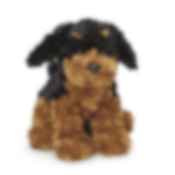 Niedlicher Kuscheltierhund mit weichem und lockigem Fell in Schwarz und Braun. Der Hund ist 25 cm hoch und kann bei 40 Grad gewaschen werden. Zugelassen und CE-gekennzeichnet gemäß EN71.