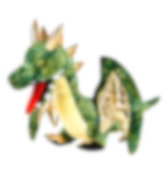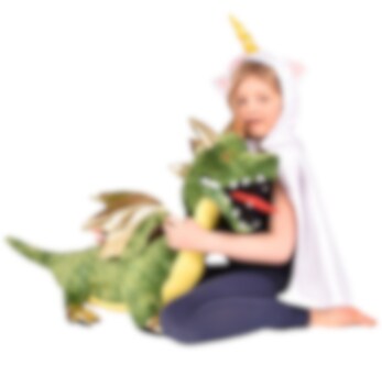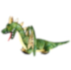 Kuscheltier in Form eines coolen Drachen in Grün mit goldfarbenen Details. Der Drache ist aus 100% Polyester hergestellt und ist 70 cm lang.