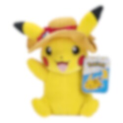 Sommer, Sonne und Pikachu! Dieses charmante Pikachu Stofftier ist bereit für Abenteuer an sonnigen Tagen. Mit einem süßen Sommerhut und einer Höhe von 17 cm ist dieses Kuscheltier der perfekte Begleiter für alle Pokémon-Fans. Bestehen aus 100 % Polyester.