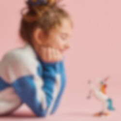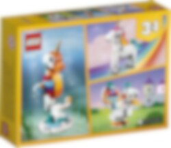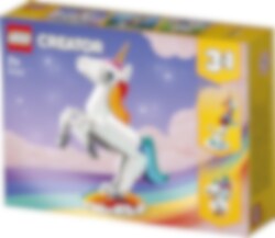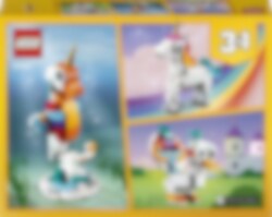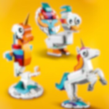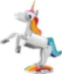 Magisches Einhorn (31140) ist ein 3-in-1-Bauset, das fantasievolle Kinder faszinierende Abenteuer in einer Fabelwelt darstellen lässt. Das Set beinhaltet ein Einhorn mit goldenem Horn, farbenfrohem Schweif und beweglichen Beinen und Hufen. Man kann die Figur in 2 Positionen bringen und entweder auf allen 4 Beinen stehen lassen und nur auf die beiden Hinterbeine stellen. Auf dem beiliegenden Ständer beeindruckt das Einhorn in dieser spektakulären Pose. Baue bunte Tiere aus LEGO® Steinen Dieses LEGO Creator 3-in-1-Set lässt kleine Baumeisterinnen und Baumeister unzählige Abenteuer mit 3 unterschiedlichen magischen Figuren darstellen. Dein Kind kann zunächst das Magische Einhorn bauen, das Modell dann in ein bewegliches Seepferdchen auf einem Ständer am Meeresgrund verwandeln oder es in einen beweglichen magischen Pfau mit farbenfrohem Schwanz umbauen. Aus den Steinen in diesem Set kann man jedoch auch eigene zauberhafte Fabelwesen erschaffen. LEGO Builder App Lade dir die LEGO Builder App herunter und freu dich auf ein völlig neues Bauerlebnis. Die enthaltenen Funktionen lassen dein Kind 3D-Ansichten der Modelle vergrößern und drehen, Sets speichern und den Baufortschritt verfolgen.