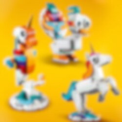 Begib dich mit diesen wunderbaren Fabelwesen in eine weit entfernte Fabelwelt. Lass das spektakuläre Magische Einhorn mit goldenem Horn durch eine Regenbogenlandschaft schreiten. Baue das Modell dann in ein Seepferdchen um, das am Meeresgrund schwimmt. Oder verwandle die Figur in einen niedlichen Pfau mit bunten Schwanzfedern. Mit diesem 3-in-1-Set hast du die Wahl.