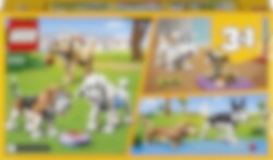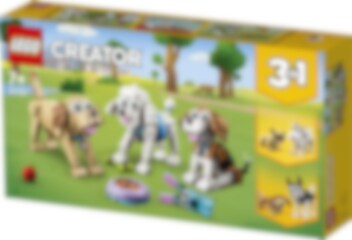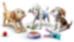 LEGO® Creator Niedliche Hunde (31137) bietet Hundeliebhabern und Kindern ab 7 Jahren Spielspaß mit diversen putzigen Vierbeinern. Das 3-in-1-Baust beinhaltet einen Beagle, einen Pudel und einen Labrador mit beweglichen Köpfen, Schwänzen und Ohren sowie einen Futternapf, eine Bürste, einen Spielzeughasen, einen Ball und eine Hundeleine für viele fantasievolle Rollenspiele. Geschenkidee für Hundeliebhaber Dieses geniale LEGO Creator 3-in-1-Spielset bietet unendlich viele Hundeabenteuer mit ganz unterschiedlichen Vierbeinern. Dein Kind kann erst einen Beagle, einen Pudel und einen Labrador bauen und die Hundefiguren dann in einen Zwergschnauzer und einen Mops oder in einen Husky und einen Langhaardackel umbauen. LEGO Builder App Lade dir die LEGO Builder App herunter und freu dich auf ein völlig neues Bauerlebnis. Die enthaltenen Funktionen lassen dein Kind 3D-Ansichten der Modelle vergrößern und drehen, Sets speichern und den Baufortschritt verfolgen.