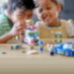 Mit dem LEGO® City Spielset „Eiswagen-Verfolgungsjagd“ (60314) können Kinder Szenen aus der TV-Serie „LEGO City – Abenteuer“ nachstellen. Das Set beinhaltet den umgebauten Eiswagen der Ganoven mit Eiscremekanone sowie einen coolen Polizeiflitzer, der Reifenkiller ausstreuen kann. Drei Minifiguren, die beiden eiskalten Ganoven und der Polizist, lassen dich dann viele spannende Abenteuer darstellen. Für Kinder ab 5 Jahren Dem LEGO Bauset liegt eine gedruckte Schritt-für-Schritt-Anleitung bei. In der kostenlosen LEGO Building Instructions App für Smartphones und Tablets ist außerdem eine interaktive Bauanleitung verfügbar. Die intuitiven Dreh- und Vergrößerungsfunktionen lassen Kinder digitale Ansichten der Modelle aus jedem Winkel betrachten. LEGO City – eine Welt voller Kreativität Die LEGO City Spielsets bieten ein spannendes Bau- und Spielerlebnis. Detailreiche Gebäude, realistische Fahrzeuge und lustige Figuren laden zu unzähligen fantasievollen Rollenspielen ein.