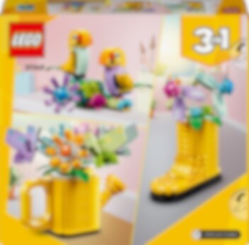 Verschönern Sie Ihr Zimmer mit dem farbenfrohen Set LEGO® Creator Blumen in einer Gießkanne. Der gelbe Krug mit Henkel und Ausguss hat 3 Blumen mit beweglichen Blättern und 3 Schmetterlinge, die aussehen, als würden sie fliegen! Bauen Sie es in einen gelben Gummistiefel mit 3 Blumen oder 2 niedlichen Vögeln um, die auf einer mit Blumen bedeckten Sitzstange sitzen. Mit diesem lustigen 3-in-1-Set haben Sie die Wahl.