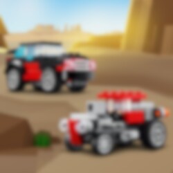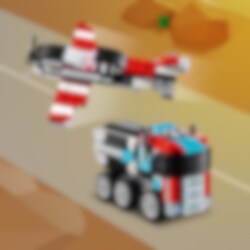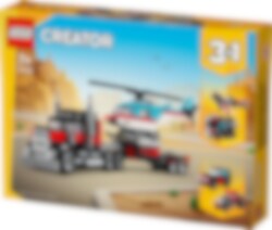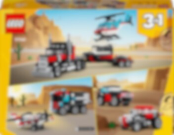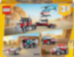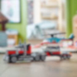 Schauen Sie in den Himmel! Ein Hubschrauber ist im Begriff, auf einer LKW-Ladefläche zu landen. Sobald er gelandet ist, kann der LEGO® Creator Pritschenwagen mit Hubschrauber in ein leistungsstarkes Propellerflugzeug mit Tankwagen oder in einen Hotrod mit SUV für spannende Rennen umgebaut werden. Sie können Ihrer Fantasie auch freien Lauf lassen und Ihre eigenen Fahrzeuge erstellen. Mit diesem 3-in-1-Fahrzeugset hört die Action nie auf!