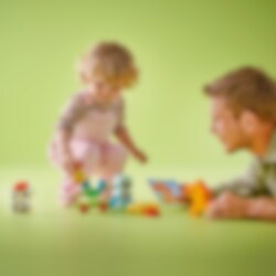 Kennst du ein Kind, das gern kreativ spielt und Spielzeugtiere liebt? Dann ist der LEGO® DUPLO® Tierzug (10412) genau das richtige Set, um Kleinkindern ab 18 Monaten beizubringen, wie man gleichfarbige Elemente kombiniert. Dieses entwicklungsfördernde Spielset für Vorschulkinder beinhaltet 4 niedliche baubare Spielzeugtiere – einen Hahn, ein Pferd, ein Lamm und eine Kuh –, die Kleinkinder zu vielen spannende Rollenspielen einladen. Kleinkinder lernen, wie man Probleme löst, wenn sie die Anweisungen auf den Karten befolgen, um die Tiere zu bauen und dann auf die farblich passenden Waggons zu setzen. Darüber hinaus enthält dieses Set 2 zusätzliche Steine, mit denen dein Kind die Tiere in kreative Spielzeugfiguren umbauen kann, die es sich selbst ausdenkt. Funktionen wie der biegsame Hals des Hahns und die Waggons, die man aneinanderkoppeln kann, fördern ganz spielerisch die Fingerfertigkeit von Kleinkindern. LEGO DUPLO Tierspielzeuge lassen Kleinkinder kreativ spielen und die Welt entdecken. Eltern teilen diese Freude und können wichtige Entwicklungsschritte miterleben.