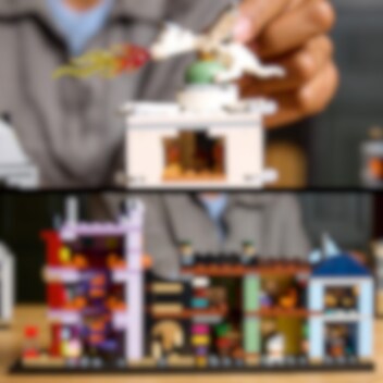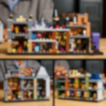 LEGO® Harry Potter Die Zauberläden der Winkelgasse (76444) ist ein unfassbar detailreiches Modell im Mikromaßstab, das dich eine Zauberwelt betreten lässt. Dieses magische Modell aus LEGO Steinen lädt erwachsene Fans der Harry Potter Fantasy-Abenteuer ein, die legendären Läden in der Winkelgasse nachzubilden, unter anderem Weasleys Zauberhafte Zauberscherze, den Eissalon von Florean Fortescue, Ollivanders Zauberstabladen, Mr. Mulpeppers Apothekarium, Gringotts Zaubererbank, Zum Tropfenden Kessel sowie das Hauptbüro von Der Tagesprophet. Jedes dieser Gebäude ist nicht nur an seiner unverwechselbaren Fassade sofort zu erkennen, sondern beherbergt auch jeweils ein faszinierendes Easter Egg. Dieses magische Modell zum Ausstellen ist ein imposanter Hingucker. Du kannst die Winkelgasse entweder mit beiden Straßenseiten oder als eine einzige lange Häuserzeile ausstellen. Oder du zerteilst die Gasse in 5 Segmente, um die Läden näher zu betrachten. Die 12 einzigartigen LEGO Harry Potter Mikrofiguren und der Fahrende Ritter werden dir viele klassische Filmszenen in Erinnerung rufen. Dieses Bauset im Mikromaßstab gehört zu einer ganzen Reihe von LEGO Sets für Erwachsene und ist eine schöne Belohnung für dich selbst oder ein tolles Geschenk für andere Harry Potter Fans.