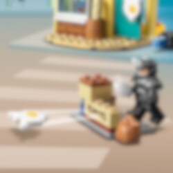 Rhino schießt mit Eiern auf den Lebensmittelladen. Er hat sogar das Fenster herausgezogen, damit die Eier drinnen zerplatzen! Spidey und seine Freunde müssen schnell dorthin! Spidey und Ghosty steigen ins Cockpit des Team-Trucks, während Spin und Black Panther auf ihren Quads durch die Hintertür hereinkommen. Nach der Ankunft steigt das Team blitzschnell aus dem Team-Truck aus und wirft Netze auf Rhino. Doch der wehrt sich und wirft mit den Lebensmitteln aus dem Geschäft!
