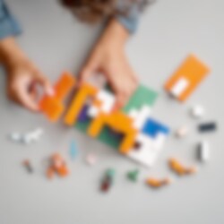 Benutze deine Minecraft® Künste, um ein riesiges Fuchs-Haus zu errichten. Dank der offenen Rückseite und des abnehmbaren Dachs lassen sich die Möbel leicht umstellen. Draußen können ein Baby-Fuchs, ein erwachsener Fuchs und ein Polarfuchs mit süßen Beeren gefüttert werden. Angeln kann man natürlich auch. Aber hüte dich vor dem Ertrunkenen! Schnapp dir dein Schwert, um den Zombie zu verscheuchen.