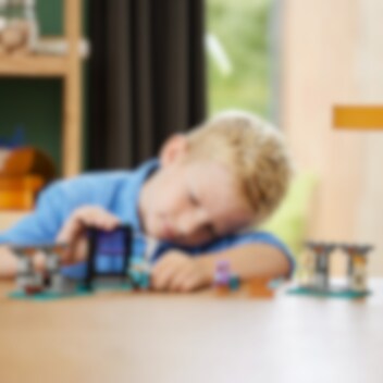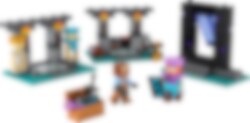 Geh in die Minecraft® Waffenkammer, wo der Waffenschmied mit Amboss, Ofen, Schleifstein und einem Kessel voll Lava arbeitet. Lass bloß keine Lava auf die Keramikfliesen tropfen! Begleite dann Alex zur Inspektion der Rüstungen. Öffne die Truhe, in der sich eine goldene Axt, ein verzauberter Dreizack, ein Diamantschwert, ein Schild und andere coole Ressourcen verbergen. Die werden dir sehr nützlich sein, wenn du durchs Netherportal zu einem neuen Abenteuer aufbrichst.