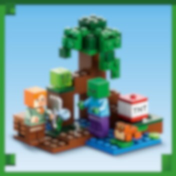 Begleite Alex durch das Sumpf-Biom. Ein freundlicher Frosch leistet dir beim Bauen und Erkunden Gesellschaft. Aber sei auf der Hut: Ein Zombie und ein Schleim liegen auf der Lauer! Lass Alex die Axt schwingen, um die beiden feindseligen Kreaturen zu vertreiben. Und betätige den Hebel, um das TNT explodieren zu lassen!