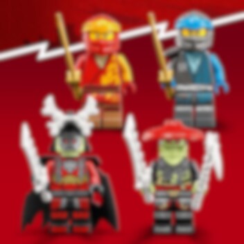 Steck Kai in seinen Mech-Anzug und setz ihn auf sein megastarkes Bike, um ihn losdonnern zu lassen. Kai und Nya müssen die grünen Skelett-Krieger verscheuchen! Der Skelett-König schwingt ein Schwert und der Skelett-Jäger hält eine Knochenhacke und ein Schwert. Durch ein Upgrade des Ninja-Bikes mit goldenen Elementen kannst du dir den Sieg holen. Wenn du diese Herausforderung meisterst, wirst du mit dem Banner der Konzentration belohnt. Dieses Banner ist ein cooles Sammlerstück.