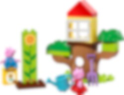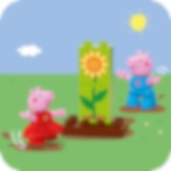 Peppa Wutz und Schorsch gehen nach draußen, um sich um den Garten zu kümmern. Sie haben eine Schachtel mit Samen dabei, um Sonnenblumen zu säen. Kleinkinder helfen beim Aussäen der Samen mit der Spatengabel und gießen das Beet mit der Gießkanne. Dann ist Fingerfertigkeit gefragt, um Steine zu stapeln und so die Blume wachsen zu lassen. In ihrem Baumhaus können sie nach der Gartenarbeit entspannen.