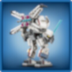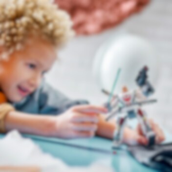 Die Macht ist stark in Luke Skywalkers X-Wing Mech! Befestige Lukes Lichtschwert am Rücken des Mechs und lass den legendären Jedi ins Cockpit steigen. Schreite los oder verstell den Raketenrucksack, um den X-Wing Mech fliegen zu lassen. Lass den Mech das gewaltige Schwert schwingen und den großen Blaster abfeuern. Diesen mächtigen Mech hält so schnell keiner auf!