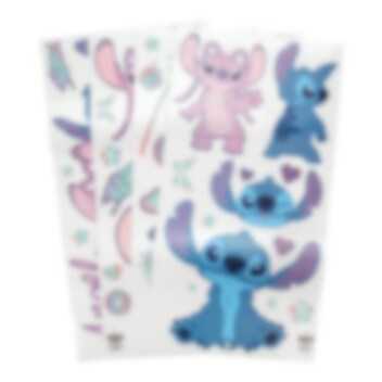 58 Wandaufkleber mit Motiven aus Lilo & Stitch, perfekt, um die Wände zu dekorieren und dem Raum eine persönliche Note zu verleihen! Die Aufkleber sind auf 4 Bögen verteilt und variieren in der Größe von 3 bis 16 cm, was Ihnen viele kreative Möglichkeiten bietet, Ihr eigenes einzigartiges Design zu kreieren.